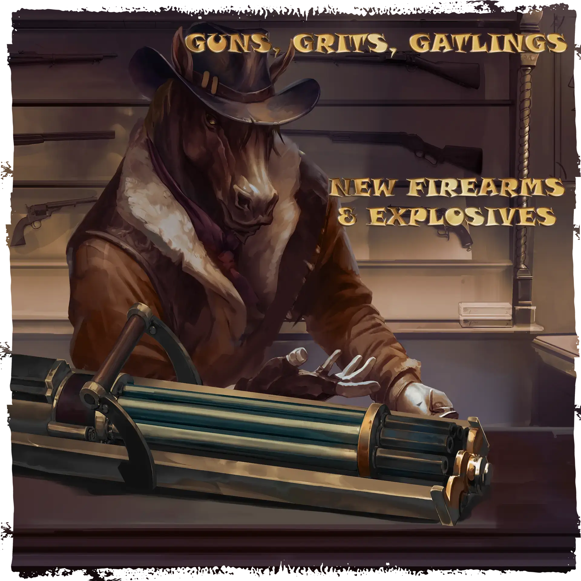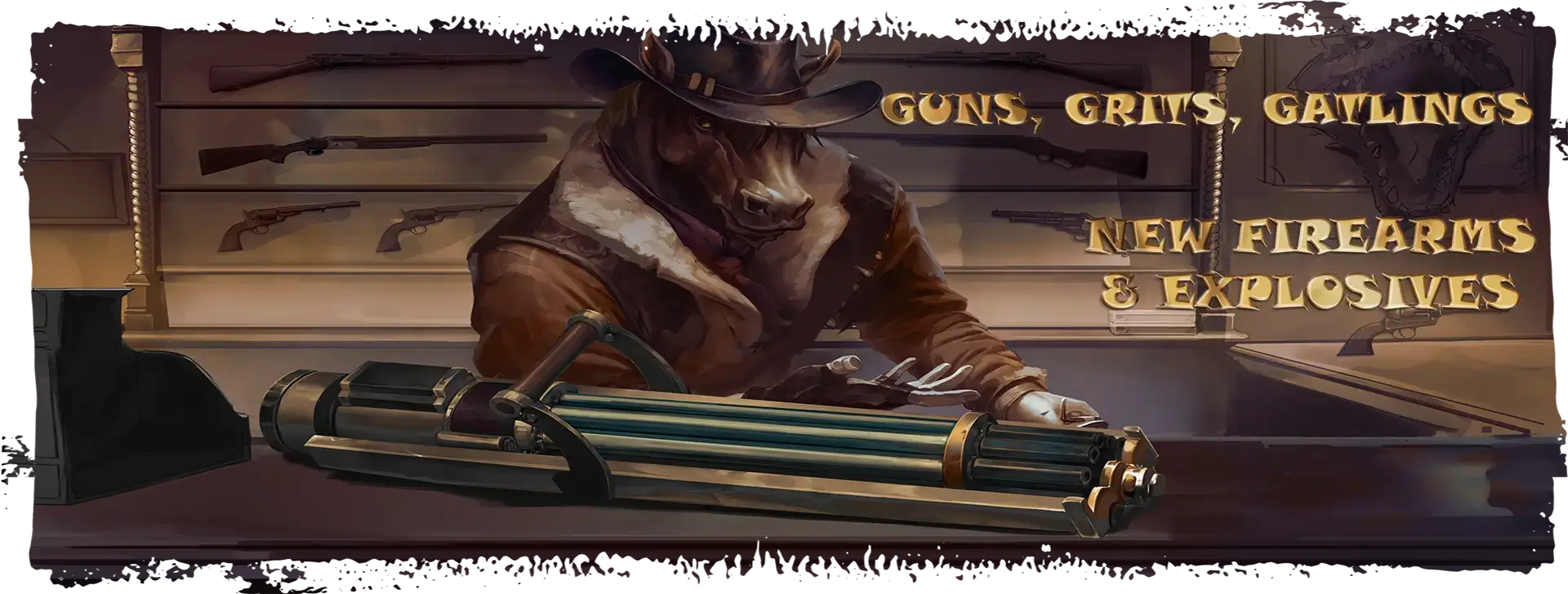 Engage with Seven new Firearm Types and Three new Explosives, as you fill your hand with the leaden power of over 100+ new Frontier Firearms, each with their own unique Art, Lore, and Mechanics. Equip new accessories, like Bandanas, Bandoliers and Stirrups that attach over existing clothing and gear.