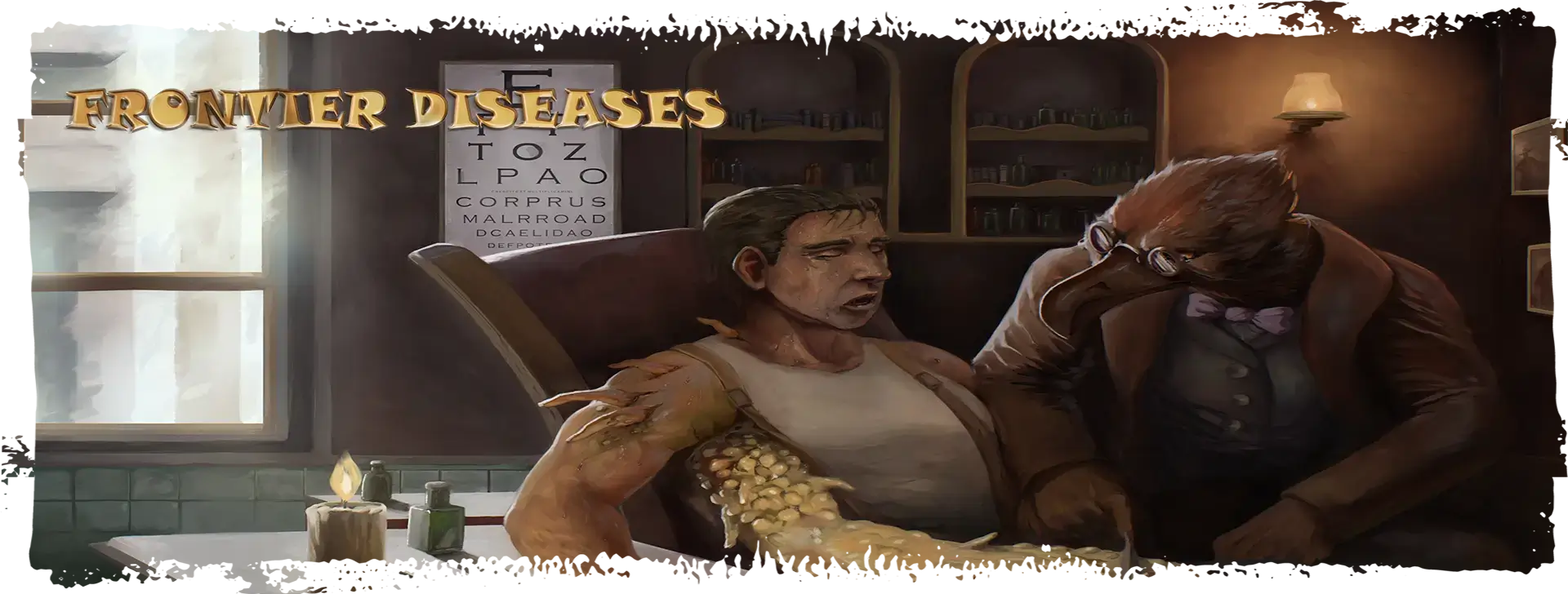 On the frontier, disease is often the greatest threat that folk face. Insidious afflictions like Blackbone can turn a skeleton to charcoal, while Skinsplit Fever sprouts painful fully-functioning digit-like warts all over the body, and Saddlestain…well what Saddlestain does is better left unsaid.