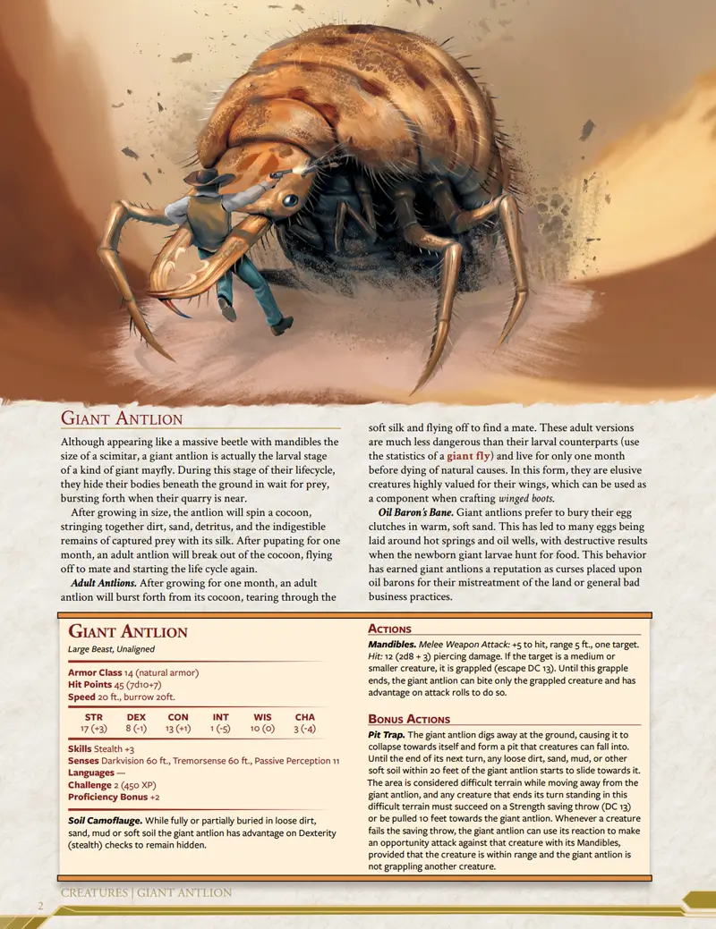 In combat, giant antlions live and die off of their surprise round. The +3 to stealth and advantage on stealth checks gives the antlion a good chance to evade detection by most adventurers in the first tier of play. Once an adventurer steps too close, the antlion will spring forth and attack with its mandibles to snag the juiciest prey. Success or failure, it will then use its bonus action to start generating a Pit Trap around itself, using its reaction to attack any creature that fails its saving throw and slides towards it. It does this each and every round until it downs a creature – taking the body and retreating into the ground with its burrow speed.